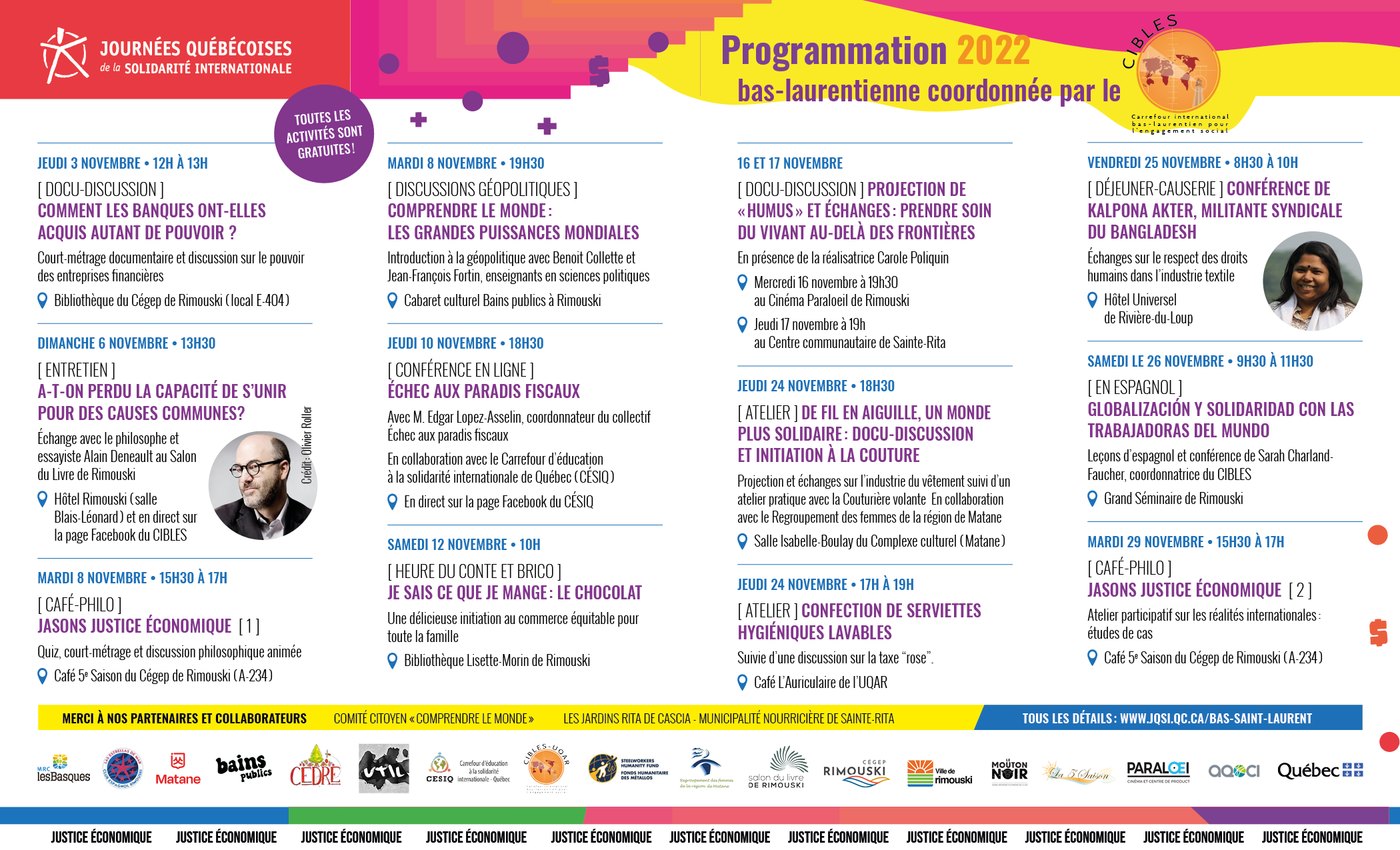 Le Carrefour international bas-laurentien pour l’engagement social (CIBLES) lance aujourd’hui la programmation des 26e Journées québécoises de la solidarité internationale (JQSI) qui proposera tout au long du mois de novembre 12 activités gratuites au Bas-Saint-Laurent autour du thème de la justice économique.