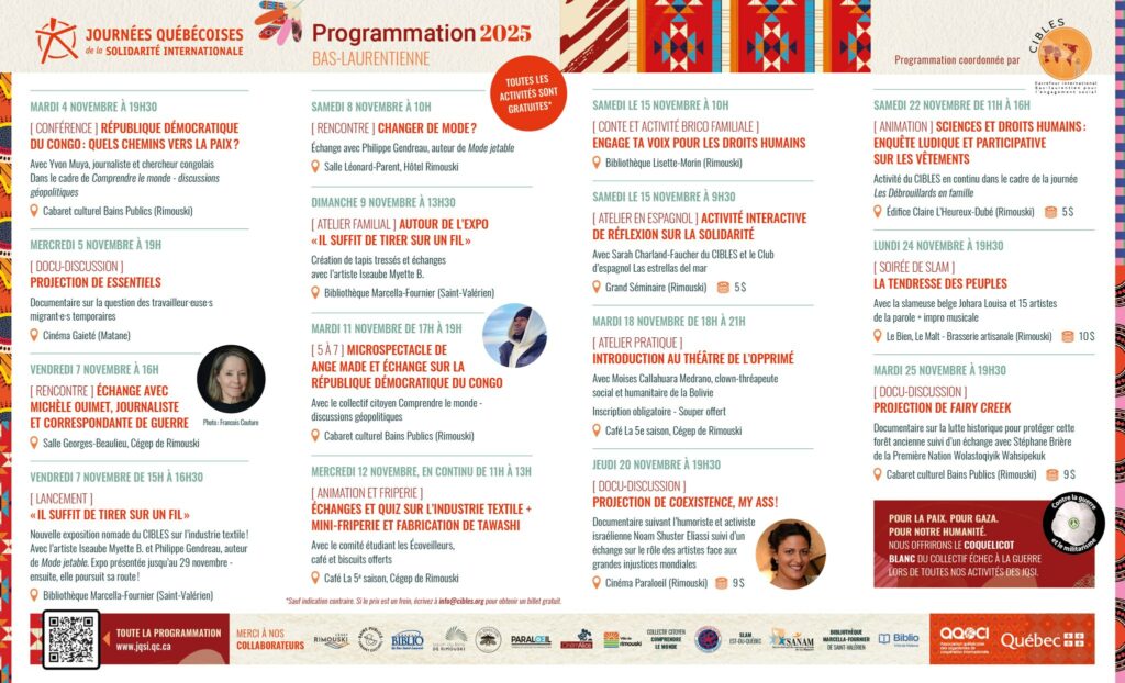 “Bien que nous ayons plus de pouvoir sur les enjeux locaux que sur des situations très loin de nous au Bas-Saint-Laurent, nous sommes une grande famille humaine complètement interconnectée dans ce monde globalisé, et nous ne pouvons faire fi des liens qui nous unissent et influencent notre présent et l’avenir des prochaines générations” explique Sarah Charland-Faucher, coordonnatrice du CIBLES et de la programmation des JQSI 2025.
